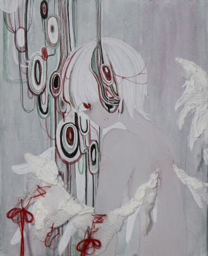 作品は、キャンバスにアクリル絵の具・水彩絵の具で描いた上から、ビーズ、刺繍パーツ、箔といった異素材を重ねる独自のスタイルで制作される。