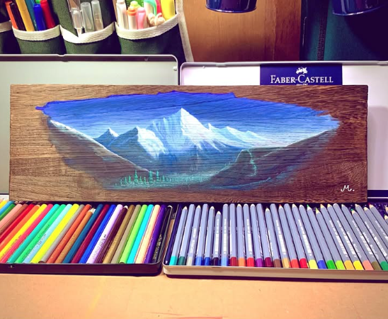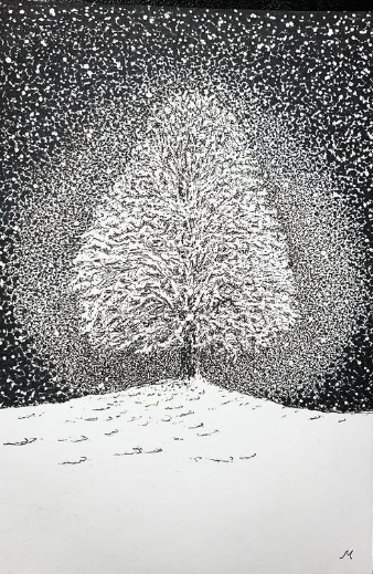 水彩・色鉛筆・パステルでは、風景や動物の一瞬の動き、表情の変化を柔らかい筆致で掬い取る。一方で、極細ペンを用いたモノトーンの作品では、自身の好きなファンタジー世界を繊細な線で緻密に描き出し、静かに広がる“想像の宇宙”を構築している。