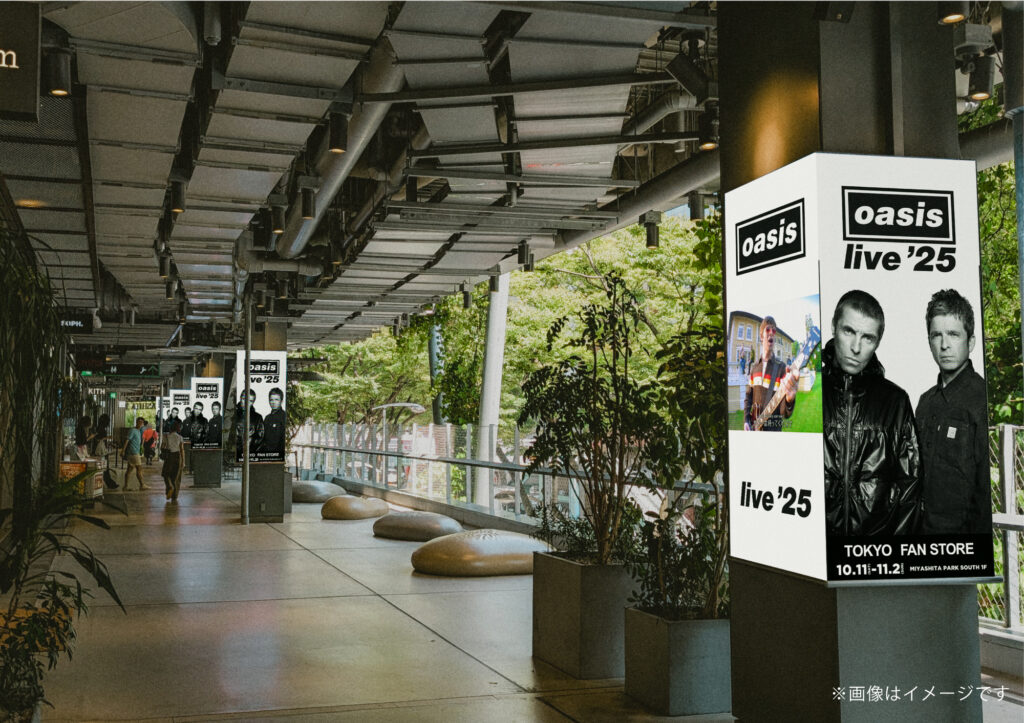 MIYASHITA PARKが期間限定でOasis一色に染まり、限定アイテム販売のほか、BGM演出やフォトスポットも登場。1994年に渋谷クワトロで初来日ライヴを行ったバンドが、31年後に再び渋谷を象徴的にジャックする。