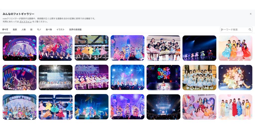 今回対象となるのは、「FRUITS ZIPPER」「CANDY TUNE」「SWEET STEADY」「CUTIE STREET」「KAWAII LAB. MATES」といった人気グループの写真である。これらの画像は、noteの機能「みんなのフォトギャラリー」から設定可能。クリエイターが提供した写真を、他のユーザーが自身の記事の見出し画像として利用できる仕組みであり、安心して創作を楽しめる環境が整ったといえる。