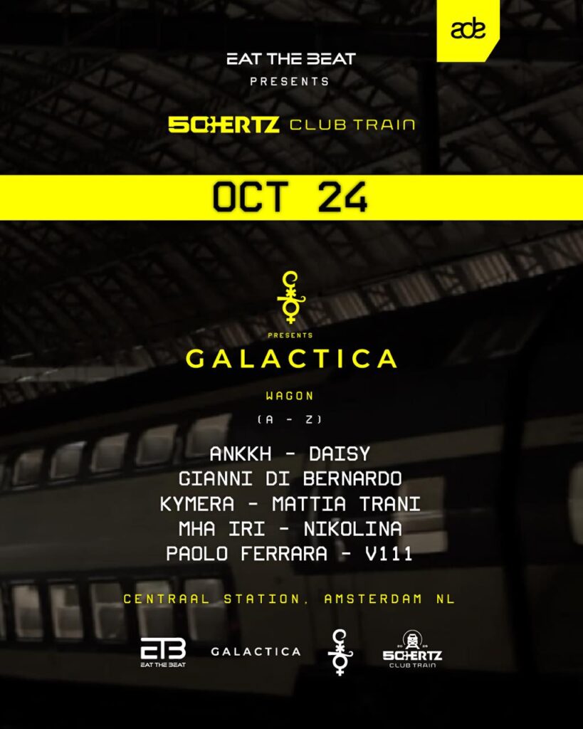 イタリアを代表するテクノ・コレクティヴ「Galactica」が、2025年10月24日(金)に開催されるAmsterdam Dance Event(ADE)に登場する。メルボルン拠点のイベント集団Eat The Beatが手がける「50Hz Club Train」の第1車両をジャックし、4時間にわたって疾走する列車をアンダーグラウンドの延長線へと変貌させる。