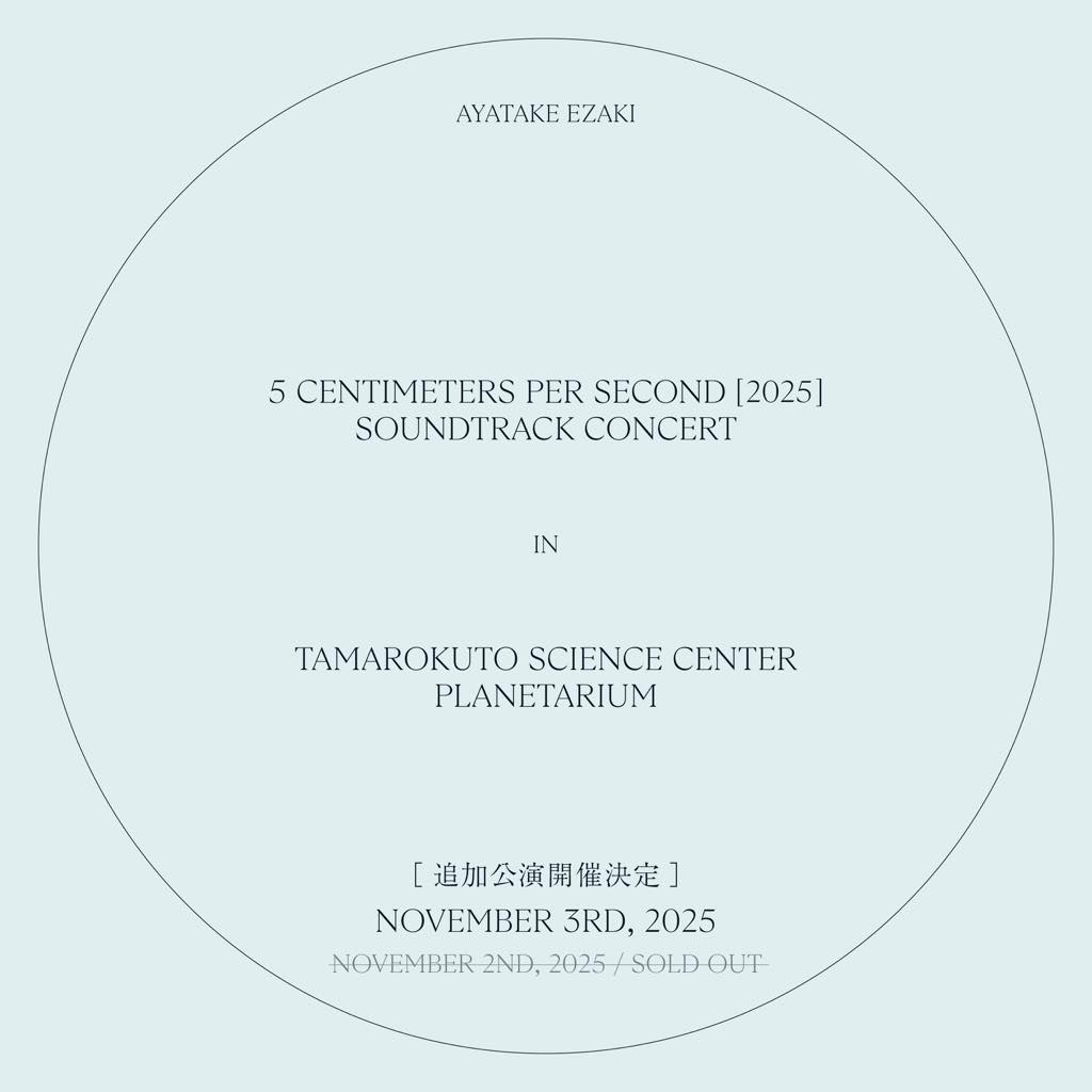 冬の気配が近づく11月、プラネタリウムの静寂の中で聴く『秒速5センチメートル』の旋律は、誰の心にも眠る“あのときの光景”を呼び覚ますだろう。