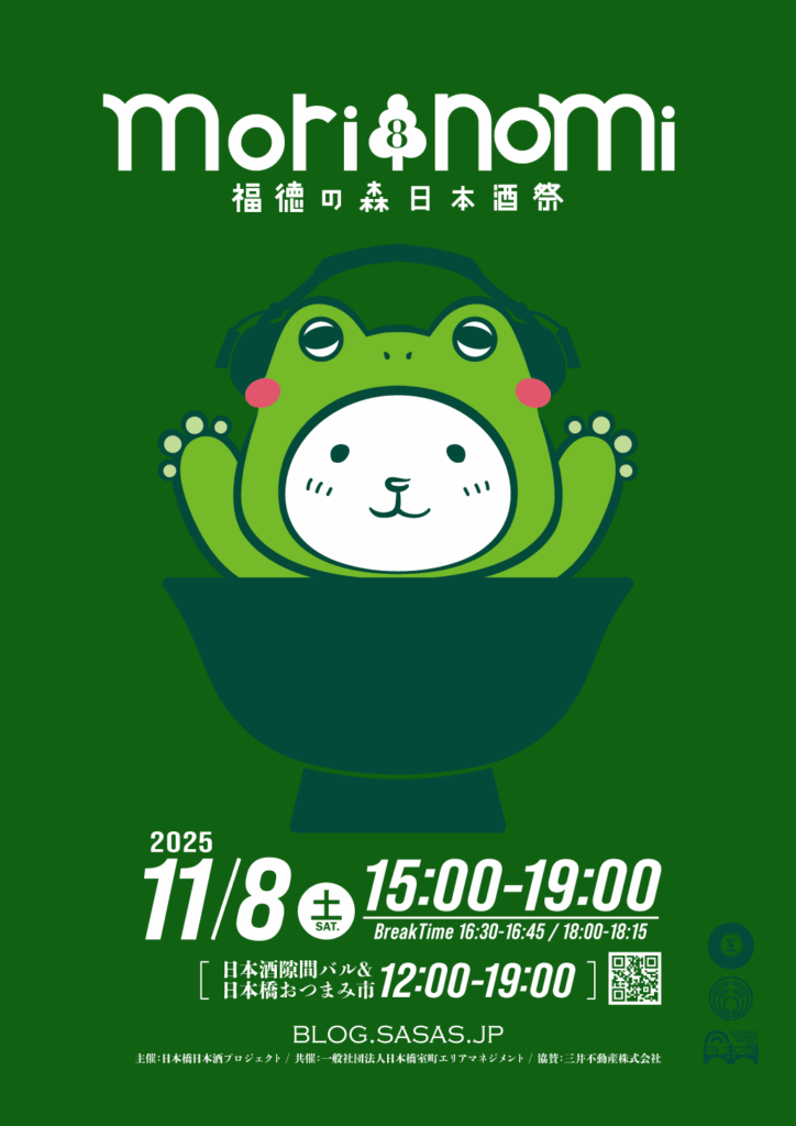 日本酒と日本橋の街の活性化を目的に活動する「日本橋日本酒プロジェクト」が、2025年11月8日(土)、日本橋室町の福徳神社隣接の広場「福徳の森」で秋祭り「福徳の森日本酒祭|morinomi8」を開催する。共催は「一般社団法人日本橋室町エリアマネジメント」。