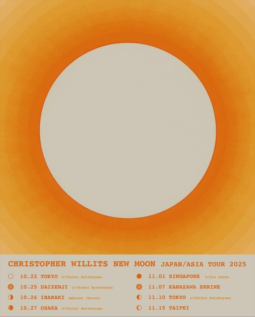 サンフランシスコを拠点とする音響作曲家/ギタリスト/ビジュアルアーティスト、クリストファー・ウィリッツ(Christopher Willits)が、最新アルバム『New Moon』を携えての来日ツアー「Christopher Willits New Moon Japan Tour 2025」を開催する。10月22日の東京・高円寺Hoipoiを皮切りに、岐阜、大阪、金沢、東京・南青山まで全6公演が行われる。