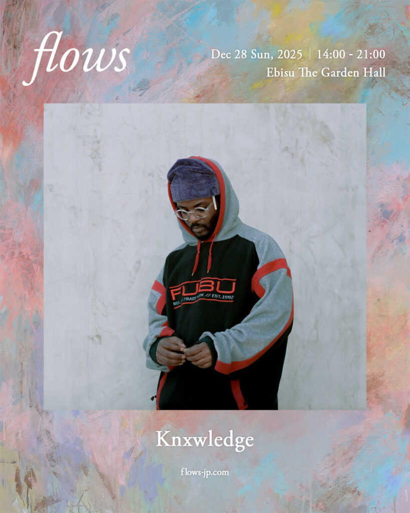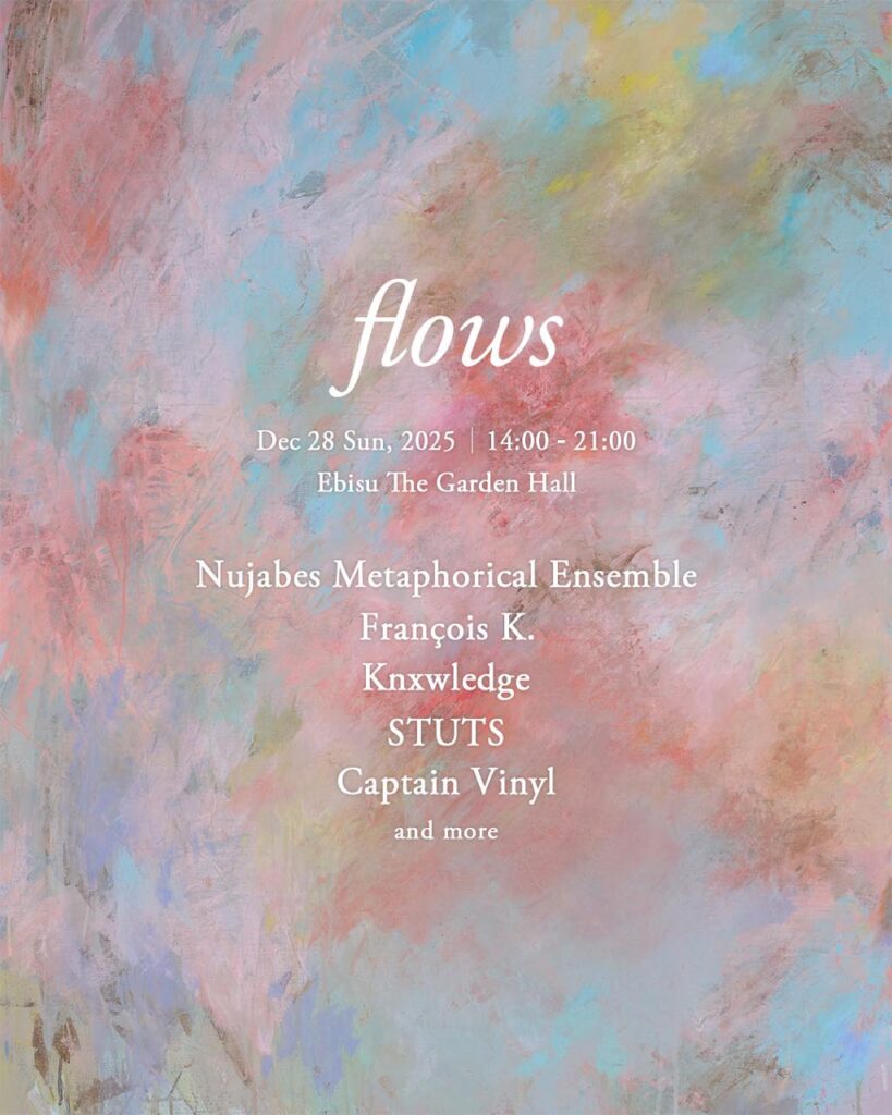 美しい旋律と深い叙情性を掲げるイベント flows が、12月28日(日)に恵比寿・ザ・ガーデンホールで開催される。Nujabesの音楽を未来へと紡ぐ Nujabes Metaphorical Ensemble(以下NME) を中心に、ダンスミュージック史の生き証人 フランソワK.、グラミー受賞ビートメイカー Knxwledge、そして追加発表として STUTS と Captain Vinyl(DJ NORI & MURO) がラインナップに加わった。