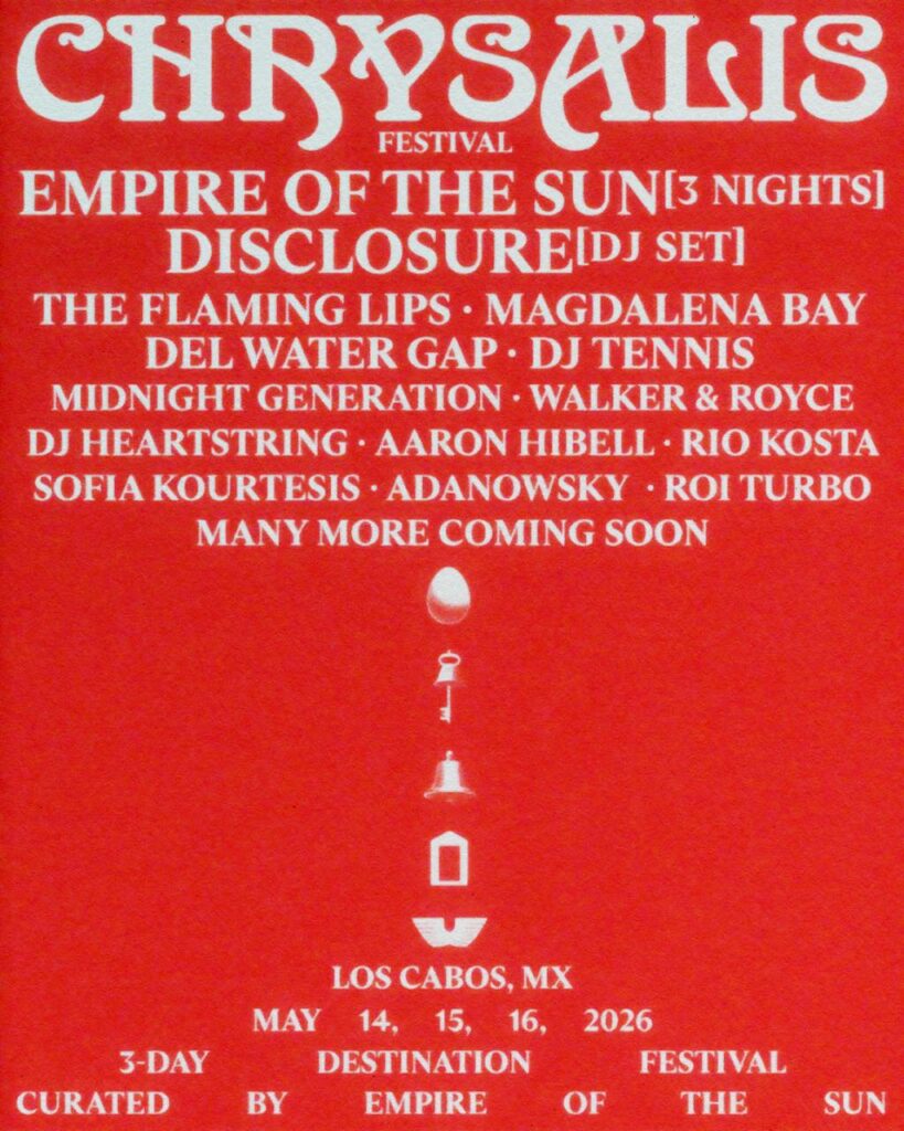 オーストラリアの幻想的ユニットエンパイア・オブ・ザ・サン がプロデュースする新たなデスティネーション・フェスティバル 《Chrysalis》 が、2026年5月14〜16日の3日間にわたりメキシコ・バハカリフォルニアの The Sculpture Gardens at Puerto Los Cabos で初開催される。その記念すべき第一回ラインナップがついに発表された。