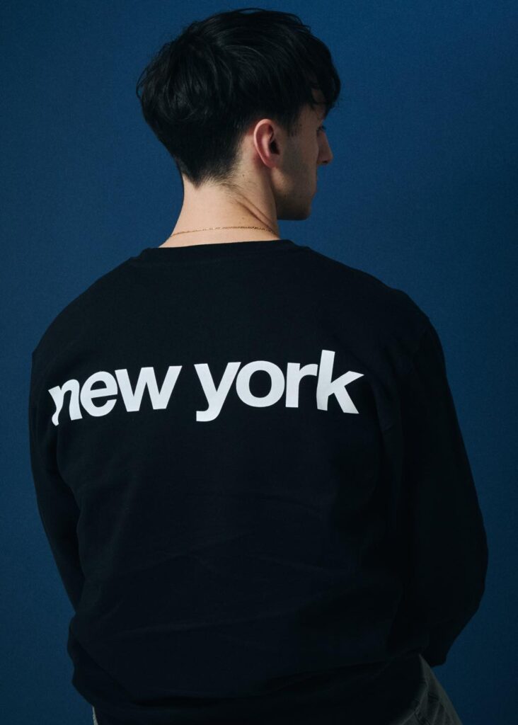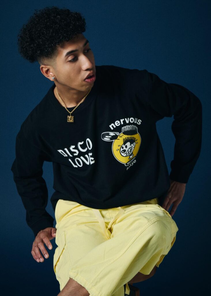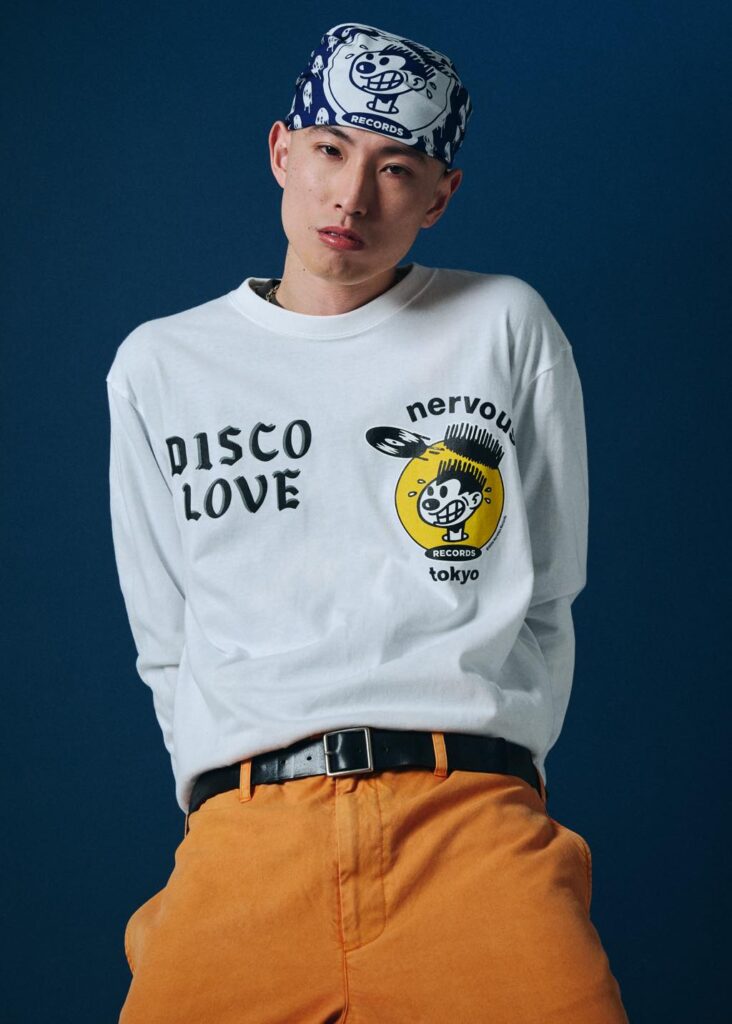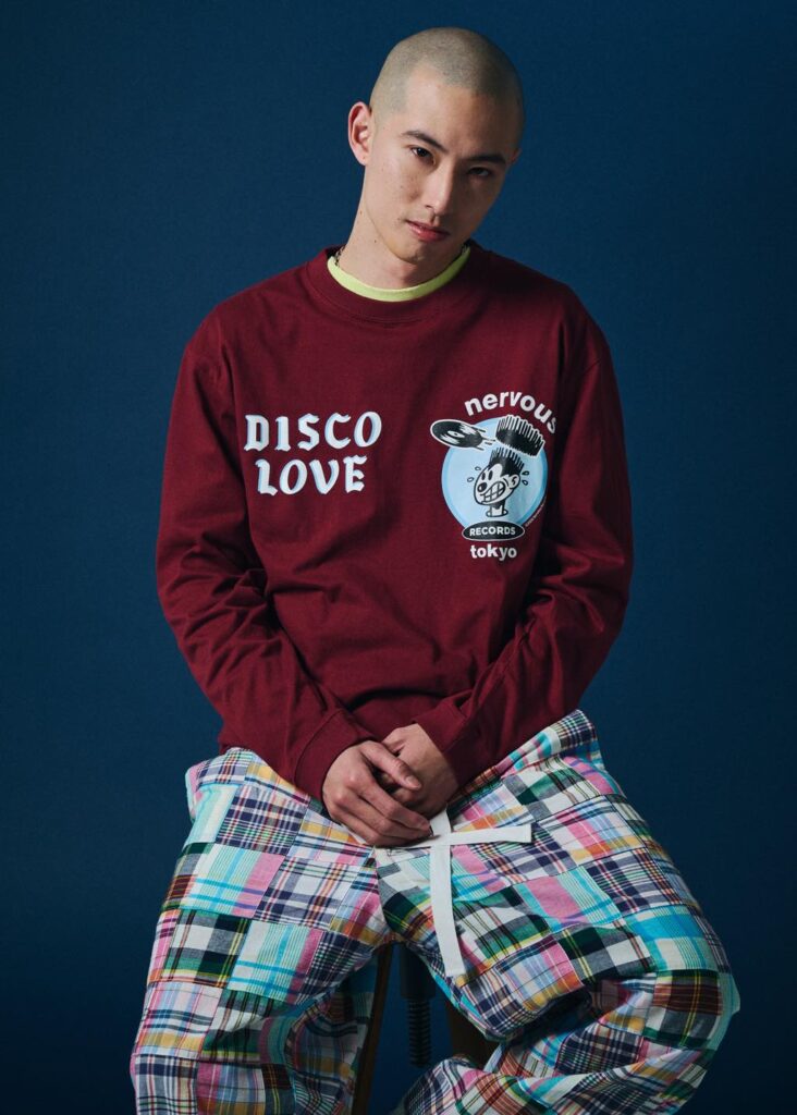 本コラボでは、日本のストリートシーンとも深く結びついたクリエイションも展開。A-1 ClothingのディレクターでありDJとしても活動する真柄尚武がデザインを担当したロングスリーブTシャツは、「Nervous Records TOKYO」や「DISCO LOVE」といったロゴを配し、NYのダンスカルチャーを東京的視点で再構築した意欲作だ。