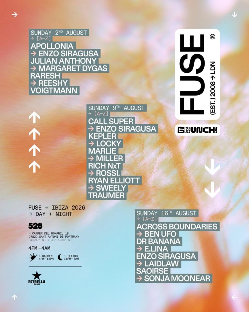 ロンドン発のクラブコレクティブFUSEと、ヨーロッパ屈指の都市型フェスティバルBrunch Electronikが再び手を組み、2026年夏のイビサに特別なシリーズを持ち込む。舞台は島屈指の個性派ヴェニュー528 Ibiza。8月2日、9日、16日の3週連続日曜にわたり、合計12時間に及ぶノンストップの音楽体験が展開される。