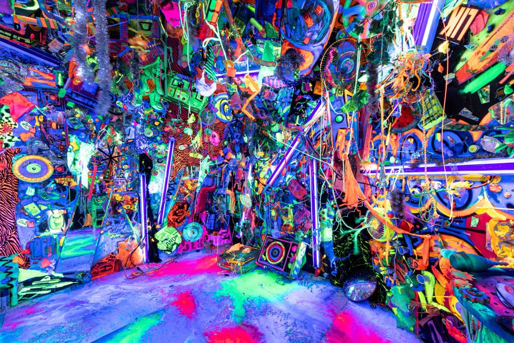 代表作《Cosmic Cavern》をはじめとしたインスタレーションは、ブラックライトに照らされることで異世界的な空間を生成。観客はまるで絵画の内部に入り込んだかのような体験を得る。